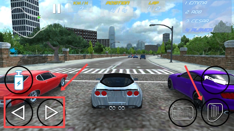 2、在比赛过程中,通过操作左侧的方向按钮来控制车辆转向,要灵活地进行操作以躲避其他对手,同时借助道具按钮释放技能,从而增强竞速时的优势。