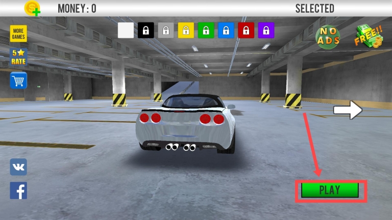 1、玩家点击绿色的PLAY按钮,选择银色跑车开启游戏,进入赛车竞技模式,准备在赛道上展开竞速比拼。