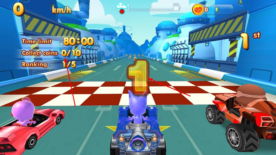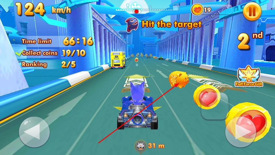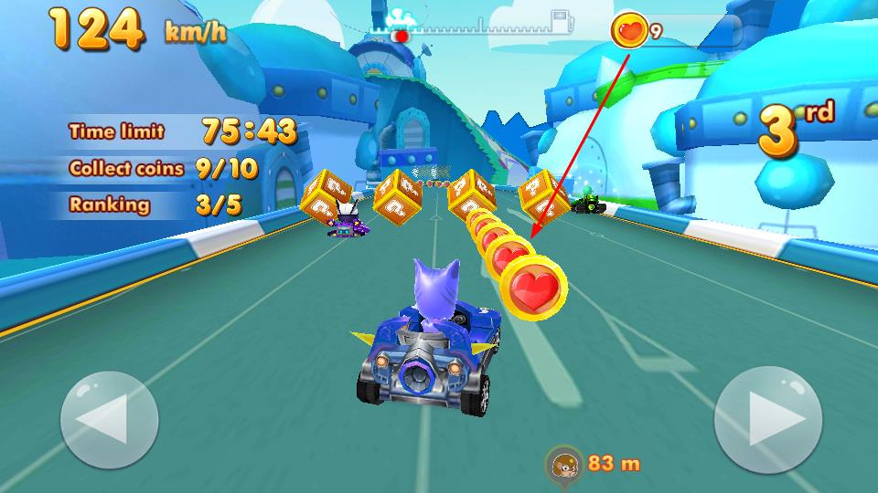 2比赛进行时,操控赛车加速前进,通过左右移动来收集赛道上的金币和爱心道具,以此提高积分并提升排名。