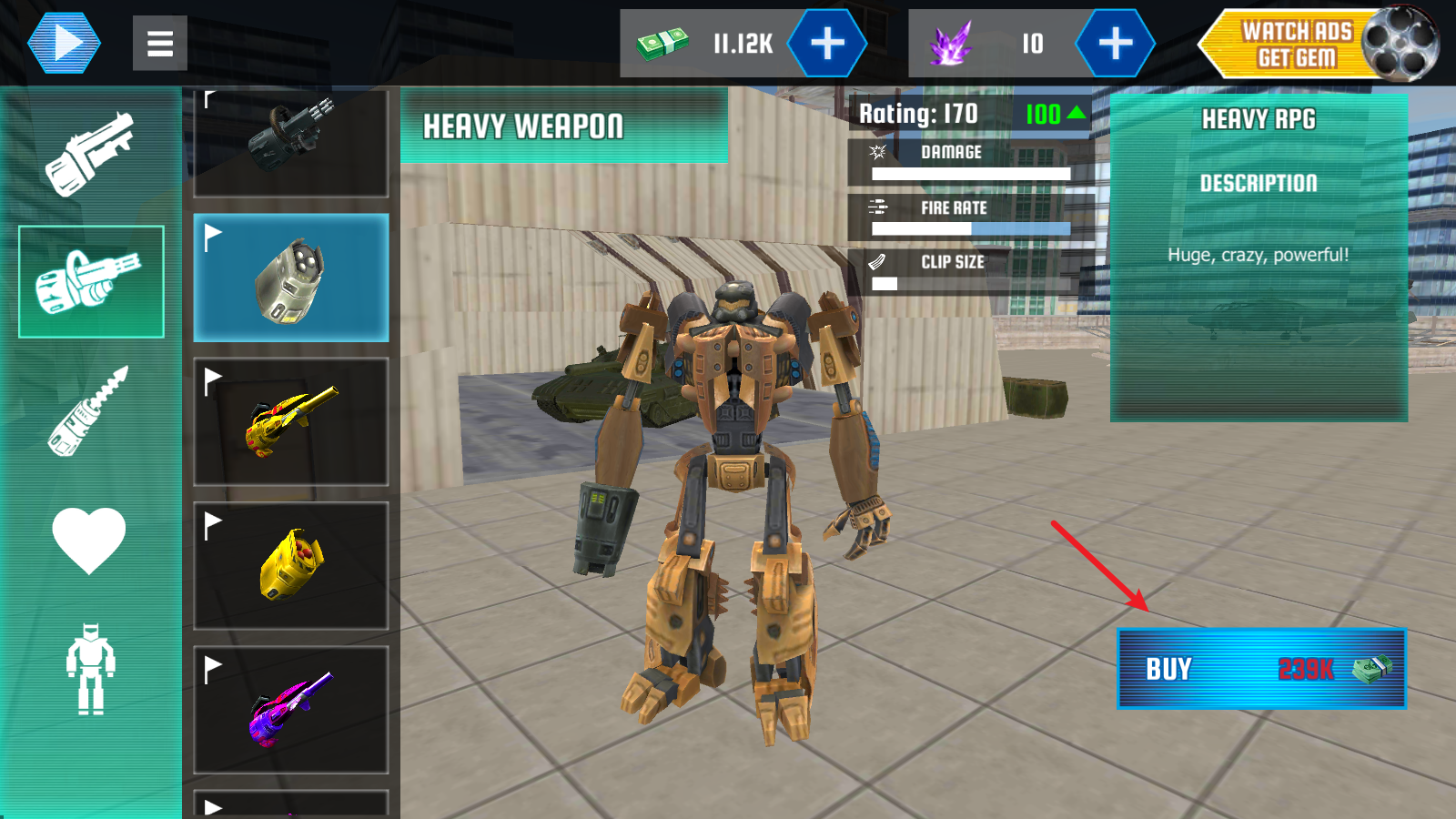 2、游戏中还有着丰富多样的武器可以去购买,为自己的机器人装配上足够的火力,消灭所有的敌人。