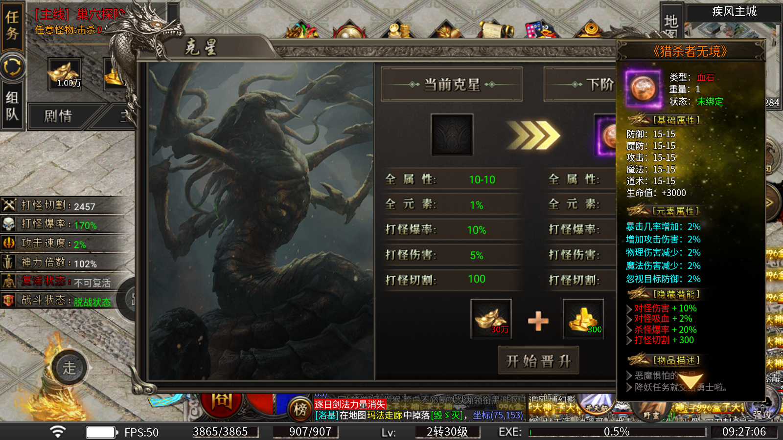 2、猎杀克星:消耗元宝和黄金即可晋升,每一级提供全属性、全元素的提升,除此之外对打怪伤害、爆率以及切割也有大幅提升!