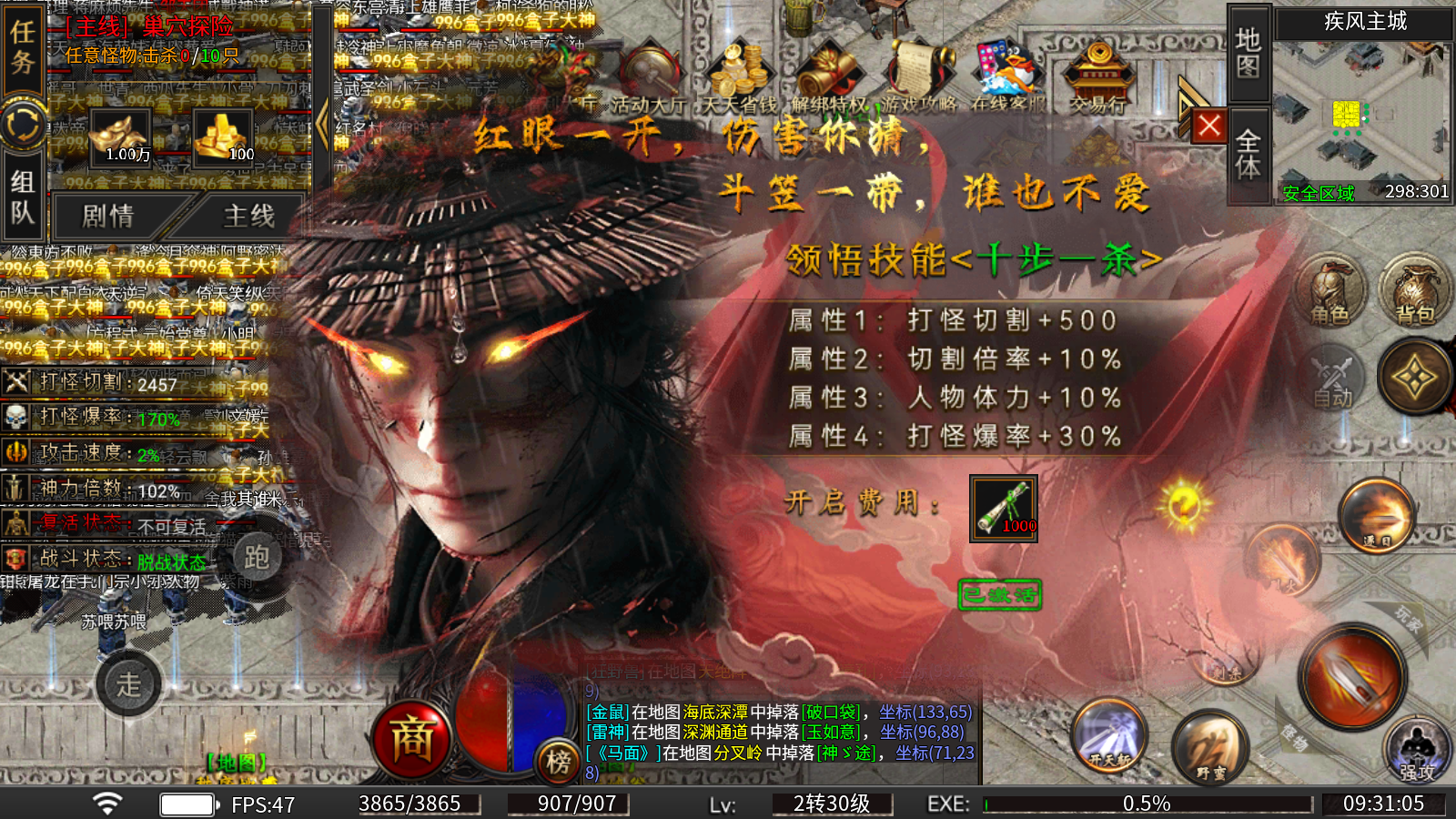 5、狂暴之力:消耗1000风卷就能开启,能够获得打怪切割+500,切割倍率+%10,人物体力+%10,打怪爆率+%30的超强属性!