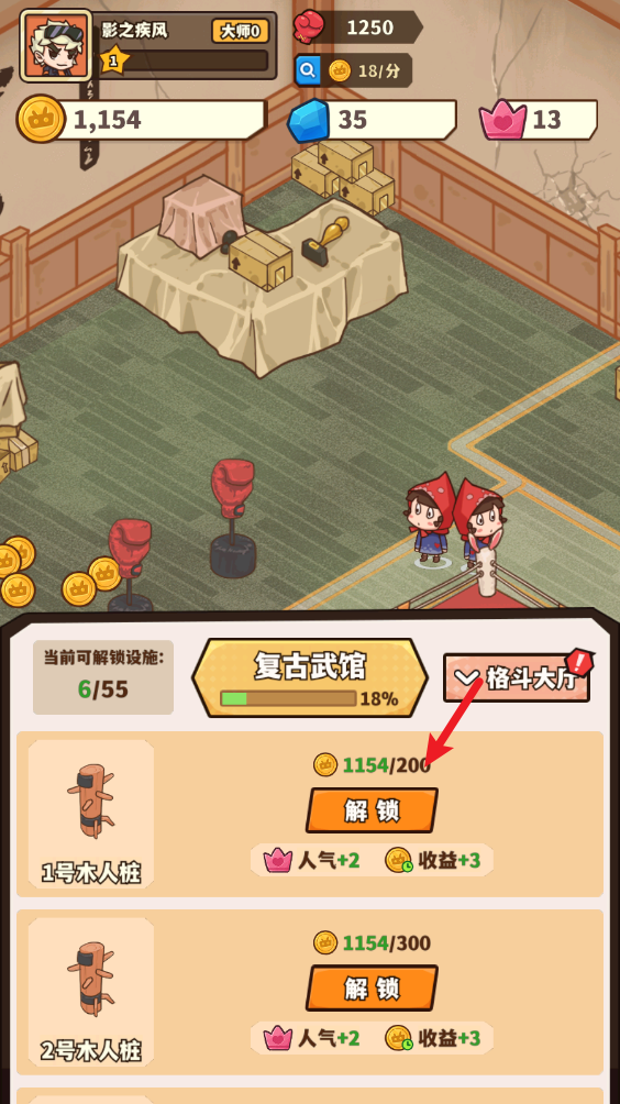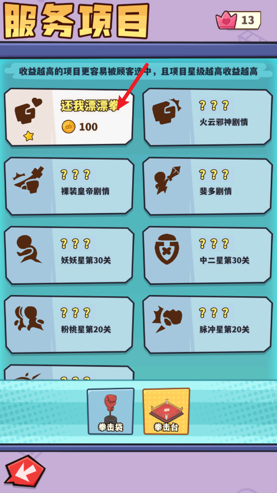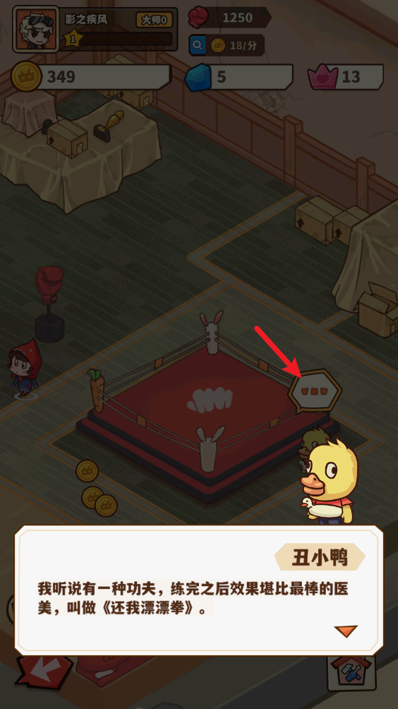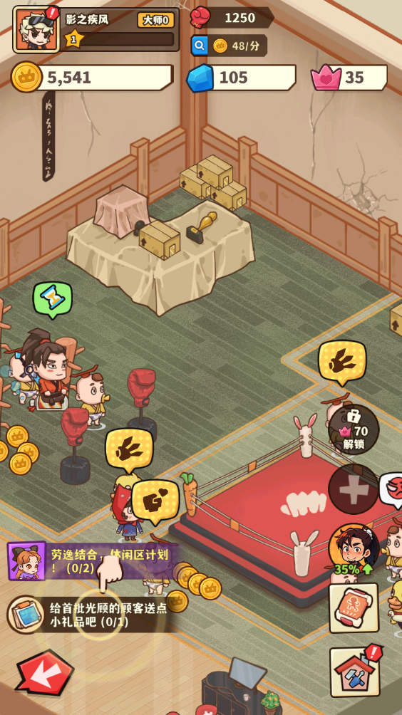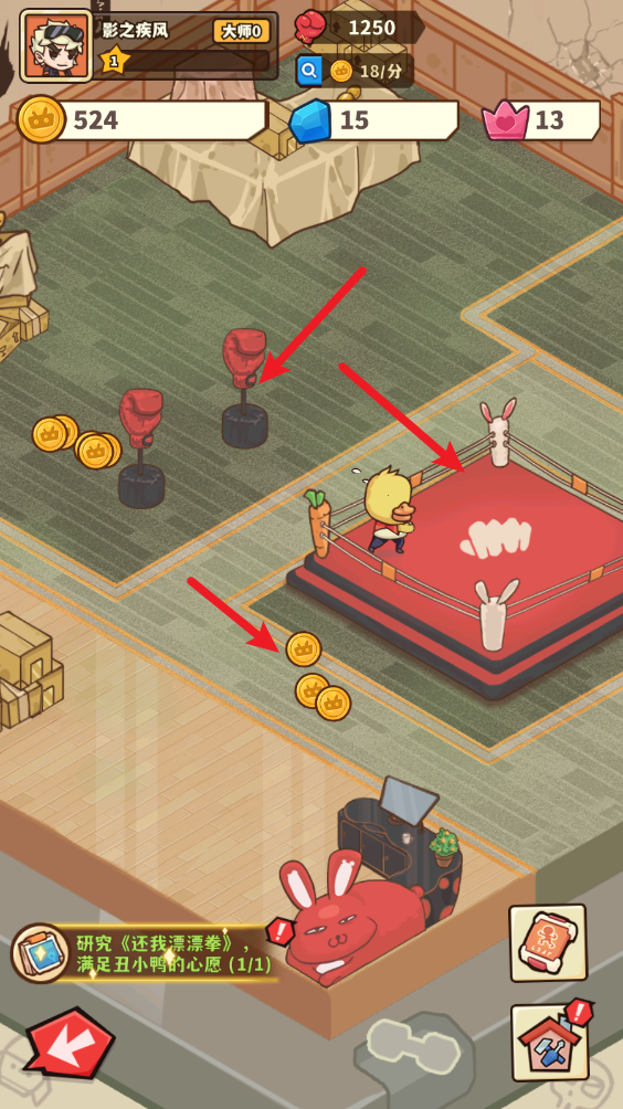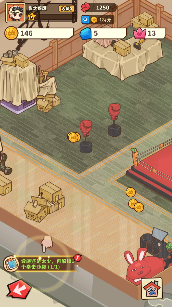 2、刚开始规模不大,我们拥有擂台和拳击沙袋可以使用,客人使用后就会留下金币。