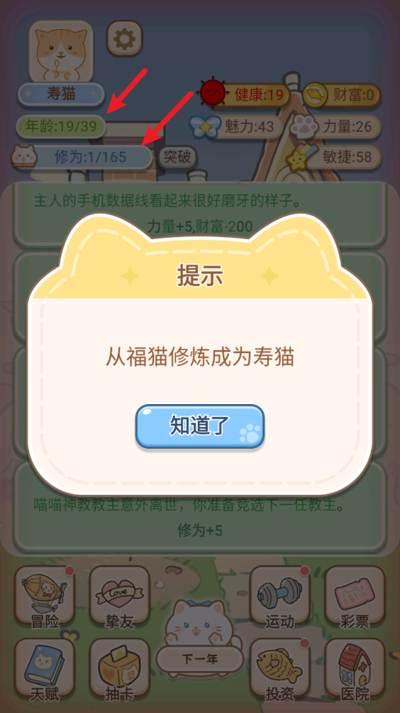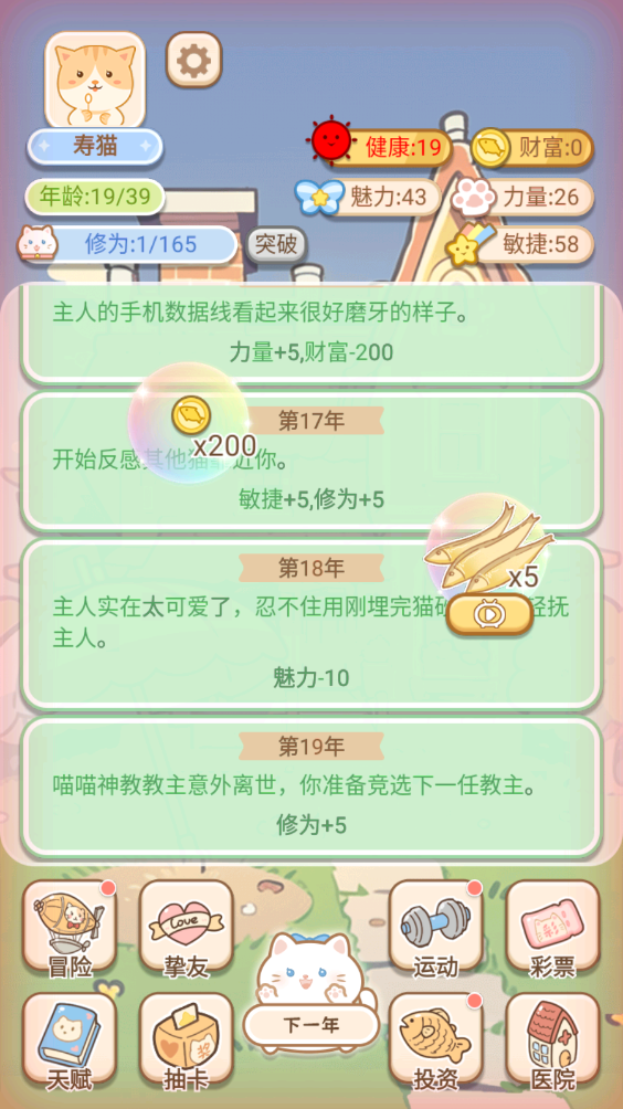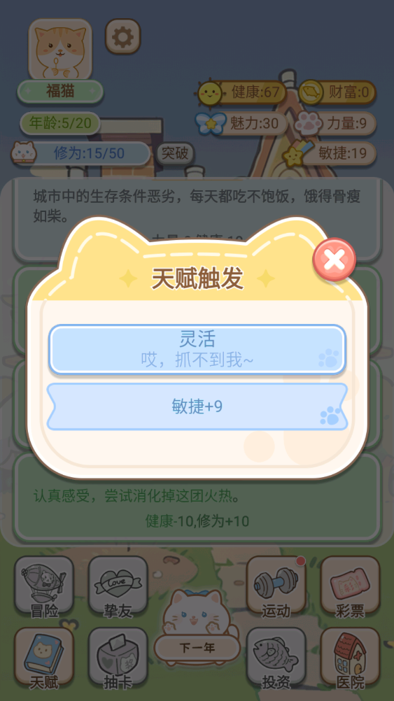 3、游戏中我们会根据每一年的事件来获得属性加成或者减少。