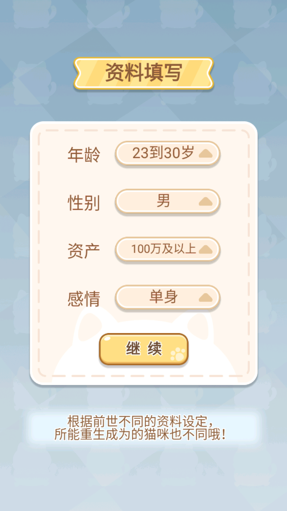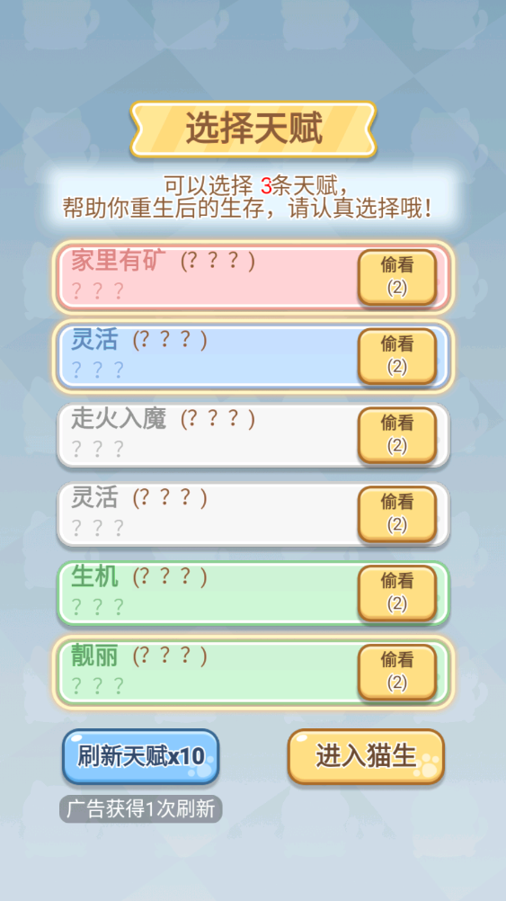2、接着选择好猫咪身份以及天赋就能正式开启猫生了。