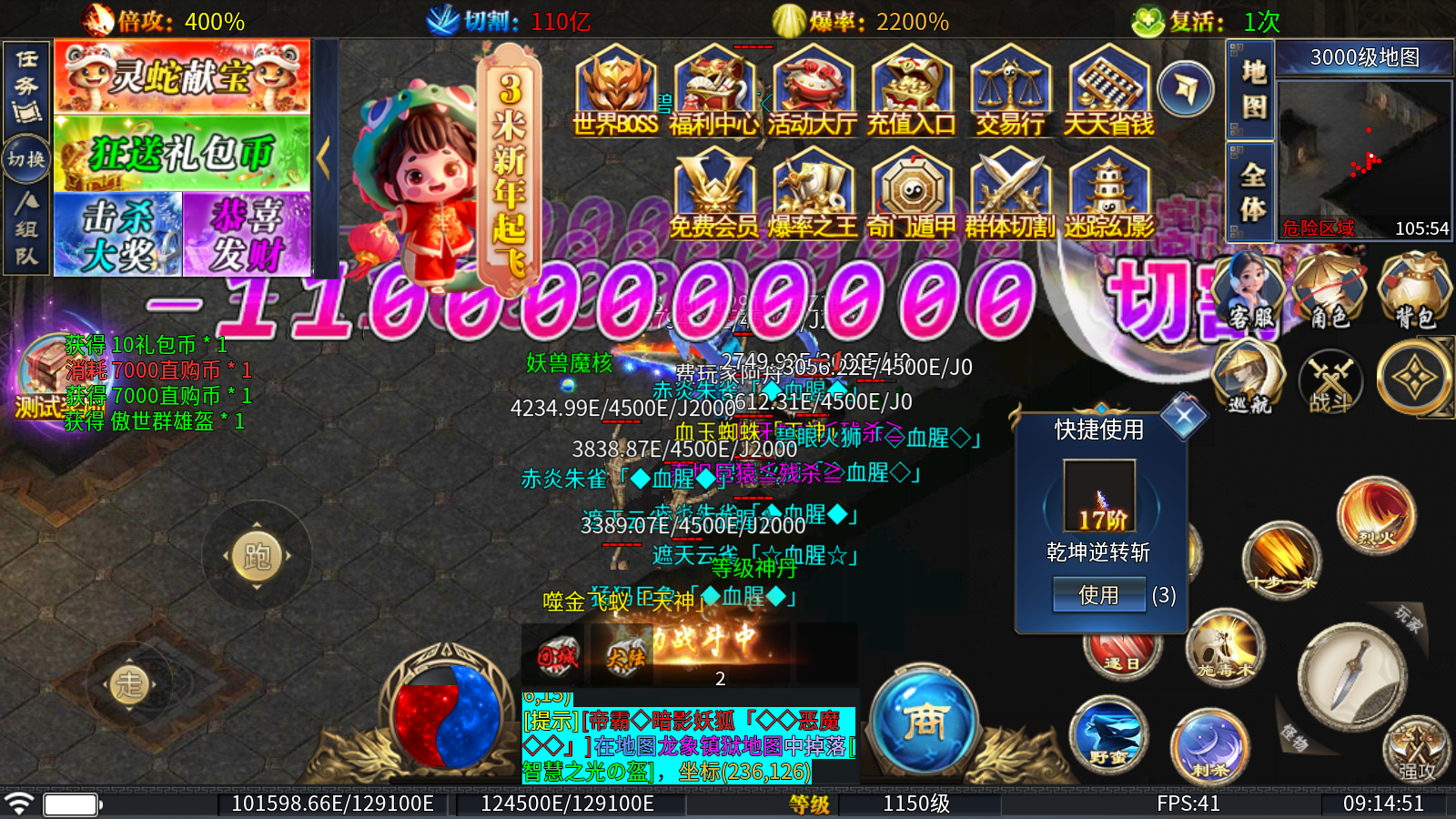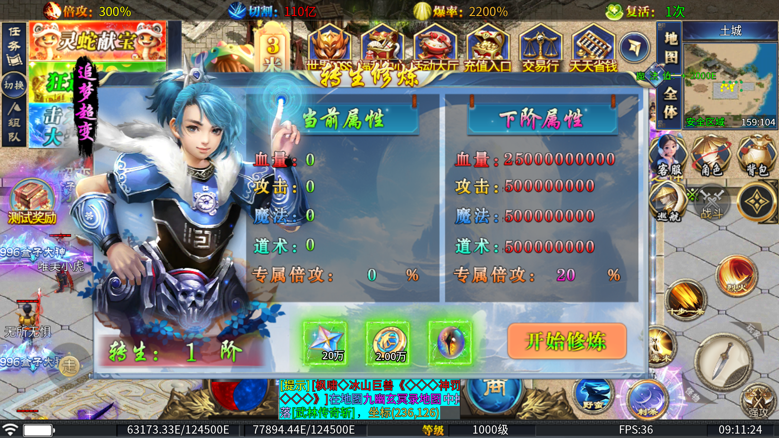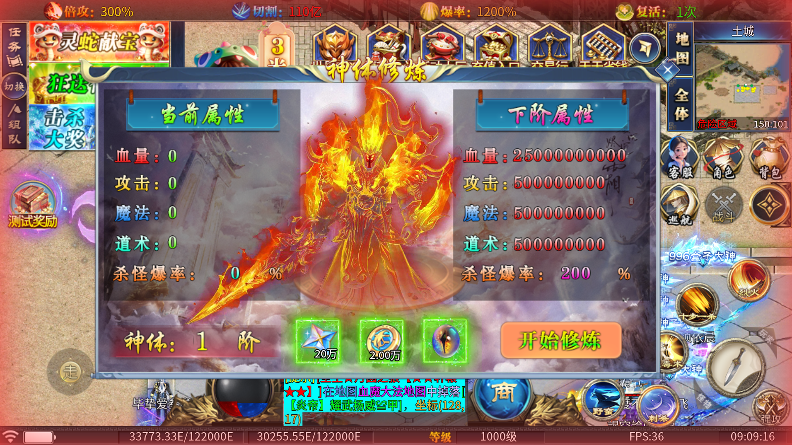 2、神体修炼:消耗追梦币、直购币和妖兽魔核即可进行升阶,提升大量属性的同时,还能提高杀怪爆率!