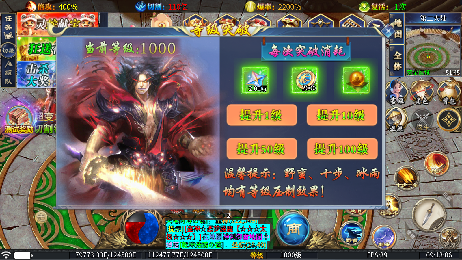 4、等级突破:人物等级达到1000级后即可前往二大陆,并消耗追梦币、直购币和等级神丹进行突破。