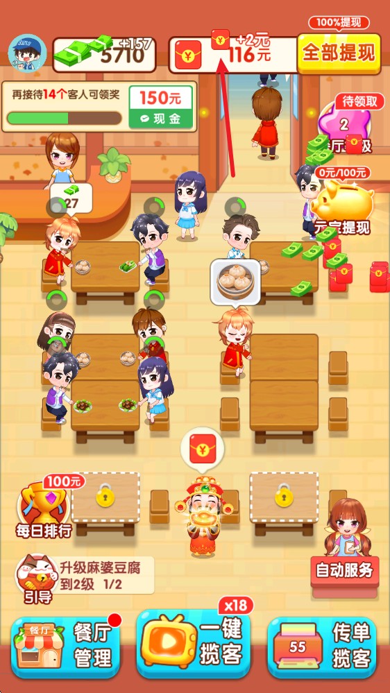 1、经营游戏,玩家烹饪各种美食,服务客人赚取收益。