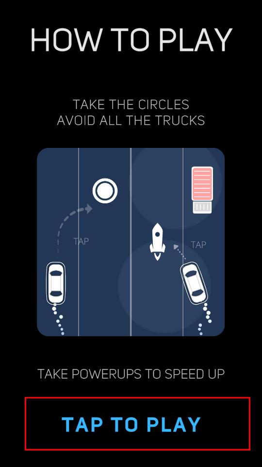 1、点击界面底部的“TAP TO PLAY”按钮进入游戏,通过点击屏幕切换位置来操控汽车在车道间移动,游戏的核心目标是收集白色圆圈道具,同时必须避让粉色卡车,一旦汽车与卡车发生碰撞。