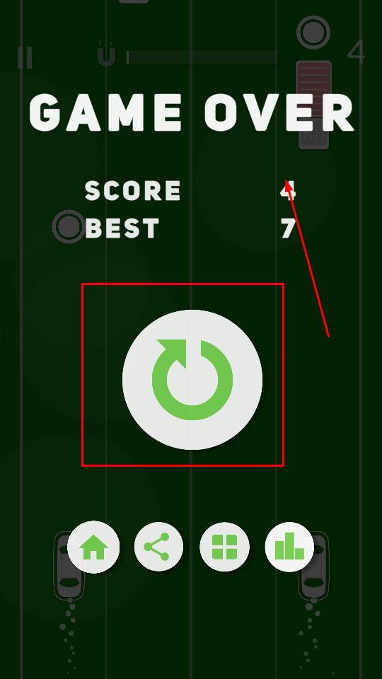 3当游戏因碰撞结束时,界面会呈现当前得分和历史最高分,这时点击界面中间的绿色循环箭头图标,就能重新开启挑战,去争取更出色的成绩。