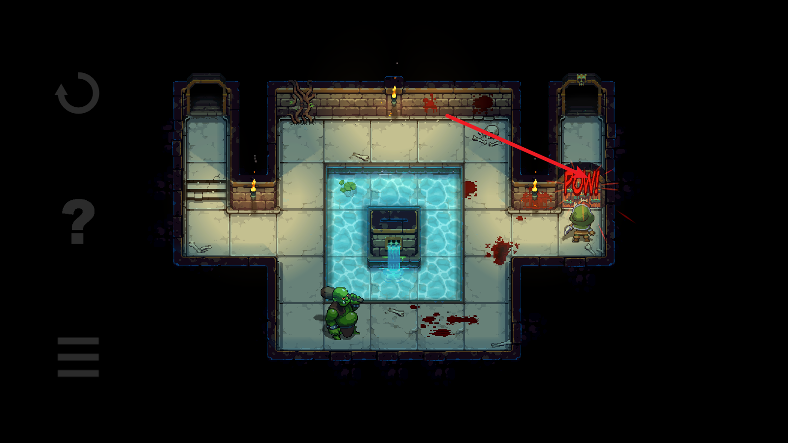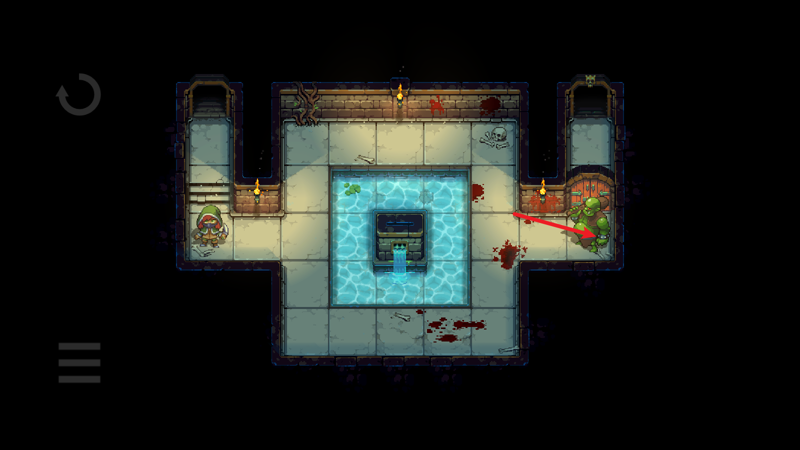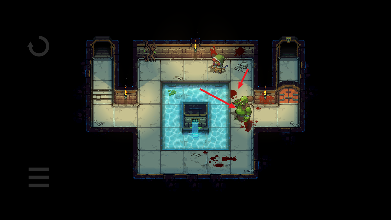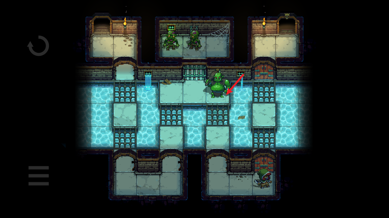 3、然后就绕着水池,将它引开,注意不要超过两格的距离,不然它就会自动回去。引开之后迅速到门口,砸开们就能前往下一层了。
