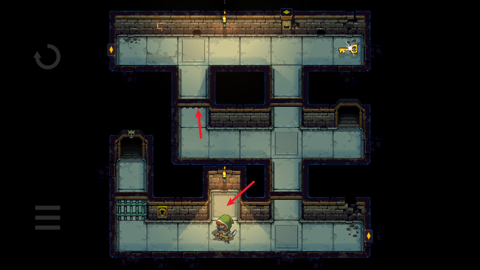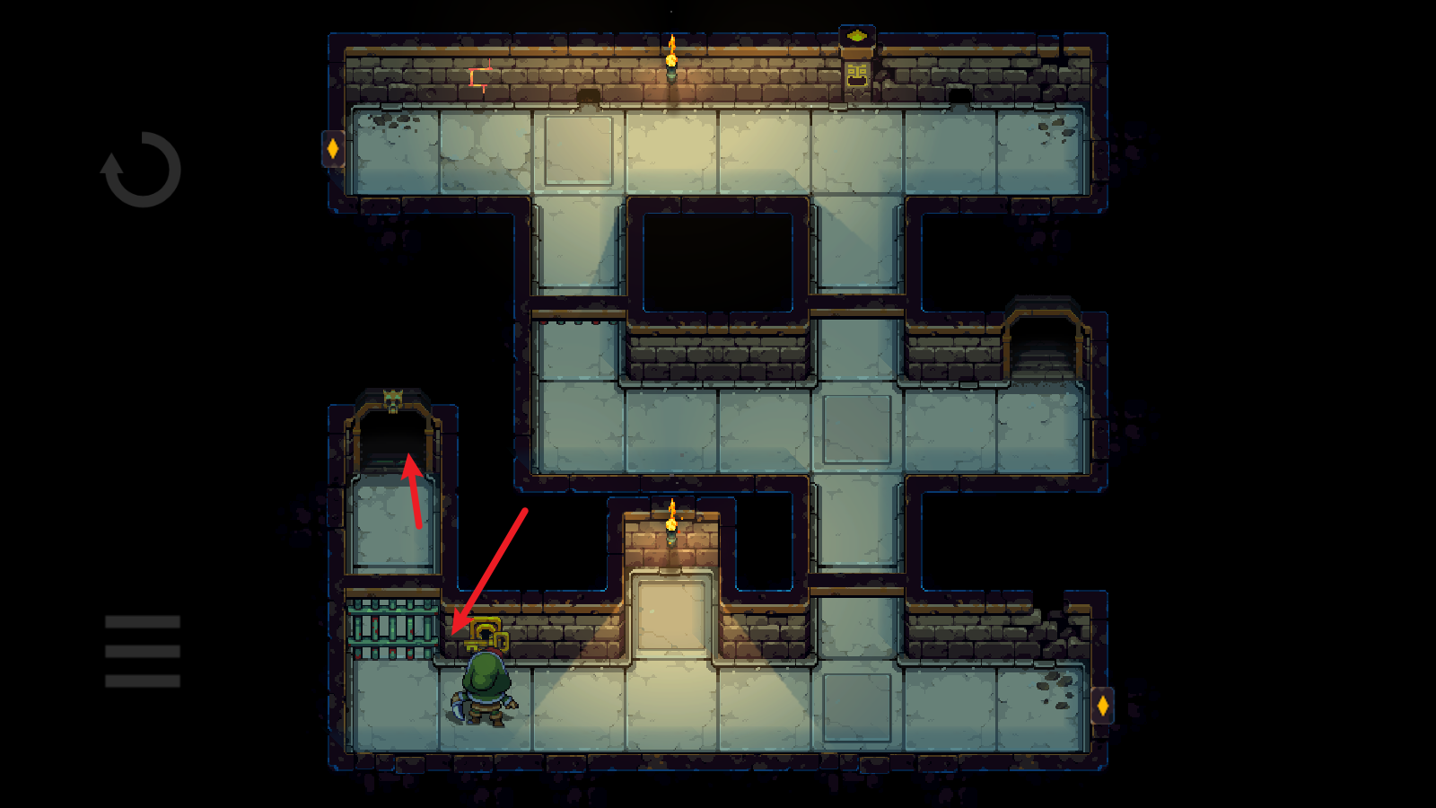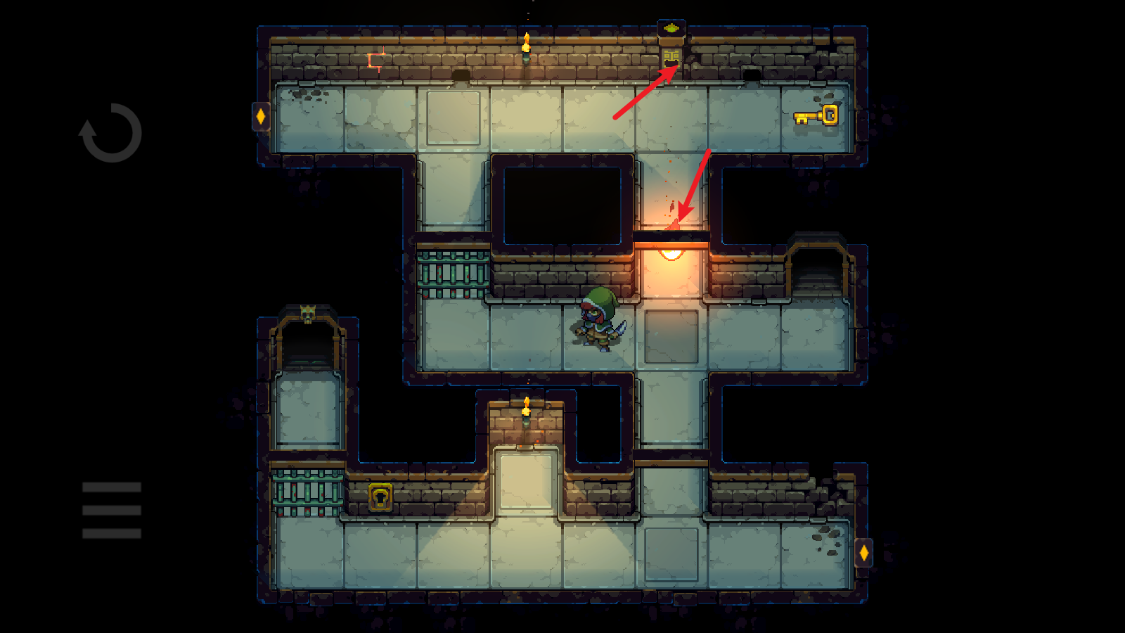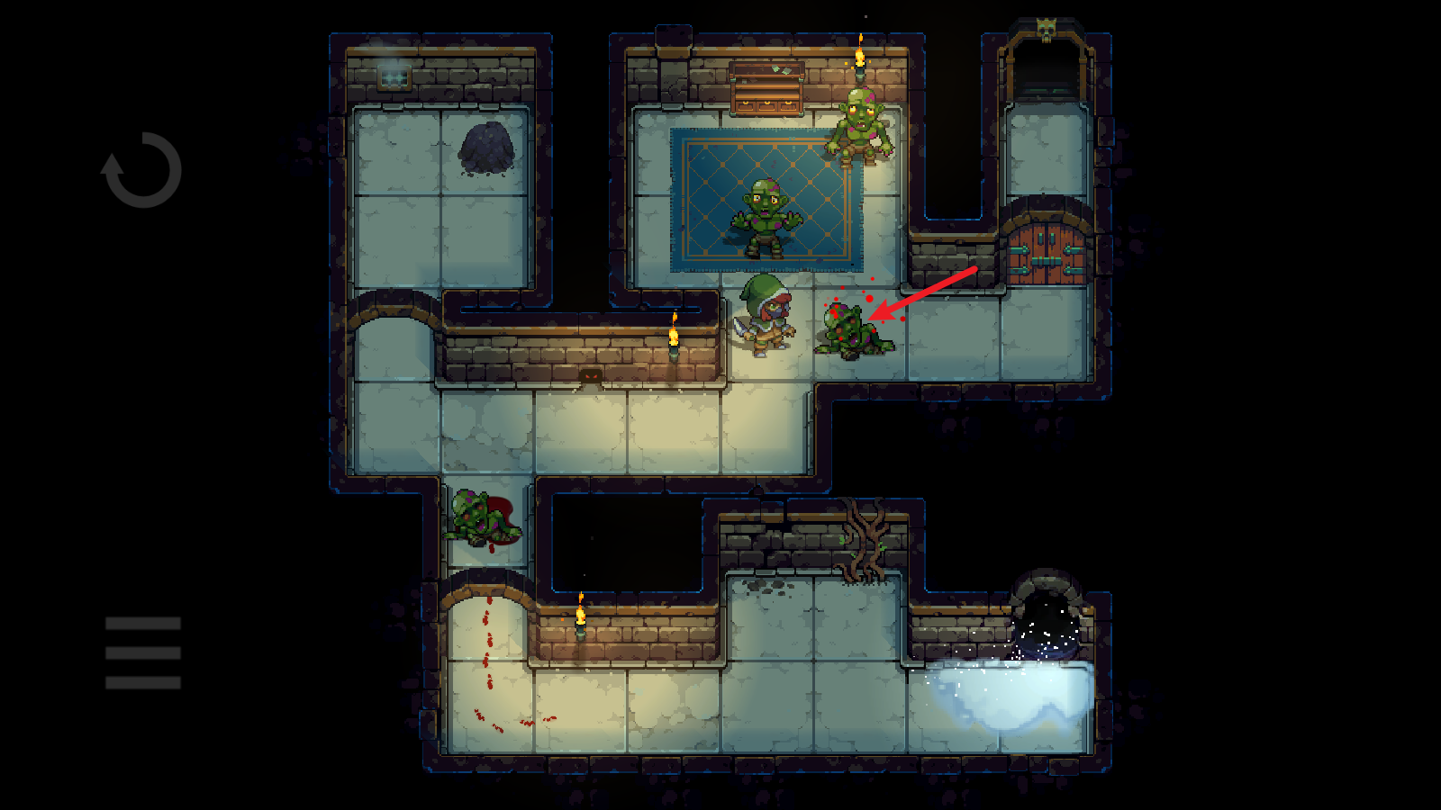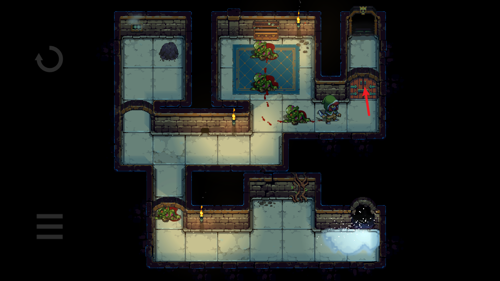 3、然后就绕着水池,将它引开,注意不要超过两格的距离,不然它就会自动回去。引开之后迅速到门口,砸开们就能前往下一层了。