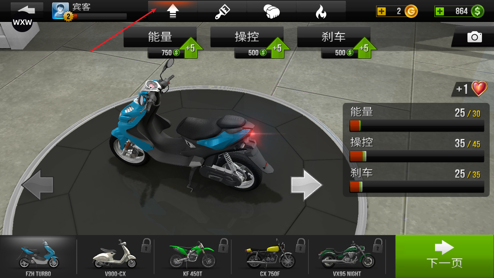 3、选中需要改装的摩托后,选中第一个的箭头按钮,可以对其的性能进行升级。