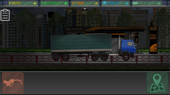 5、点击第五个按钮会正式驾驶卡车上路,行驶过程中点击右边的按钮是前进,左边的是刹车。