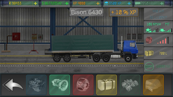 2、选好卡车和货箱后点击界面的第二个按钮可以对卡车进行改装,能升级的卡车的各个配件。