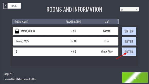 4、如果想要进入其他玩家的房间,在联机界面点击房间后面的enter就可以进入和其他玩家一同游玩了。