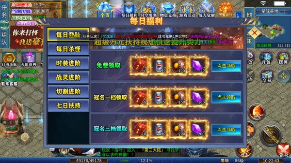 1、进服跟随本服指引任务领取进服豪礼,咔咔提升;