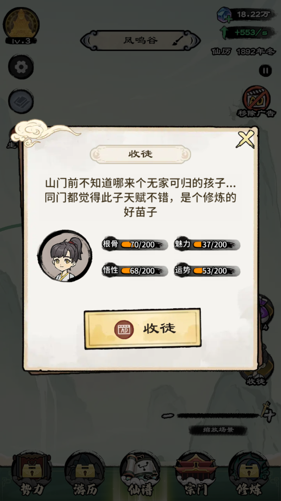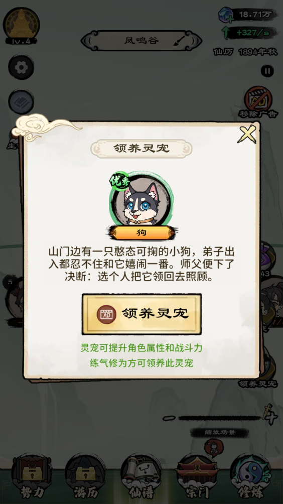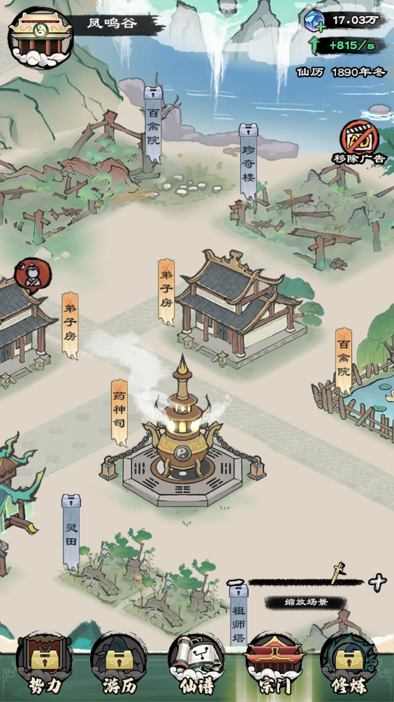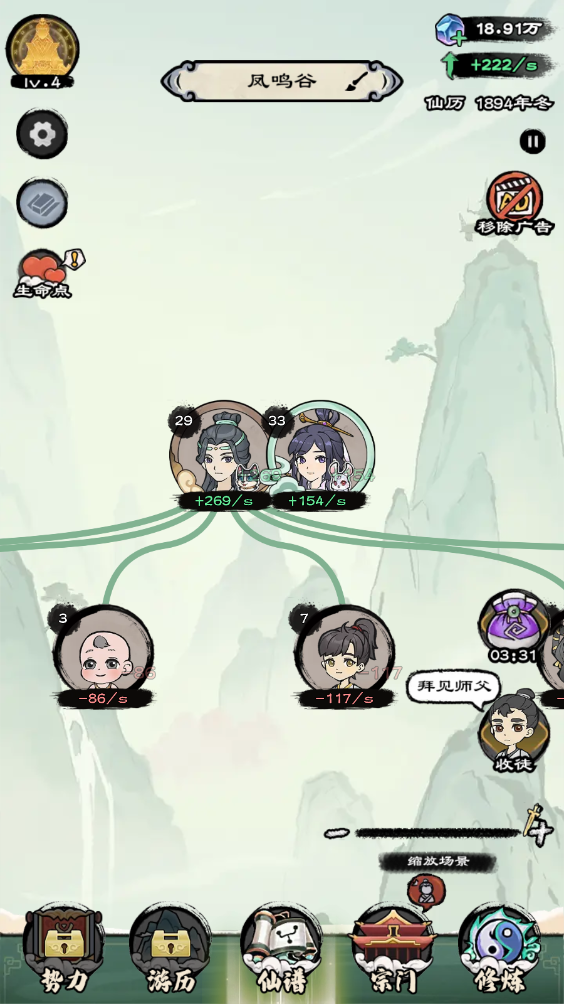 1、宗门:到达3级之后开启,可以在这里建设各种设施,派遣弟子进入修炼。