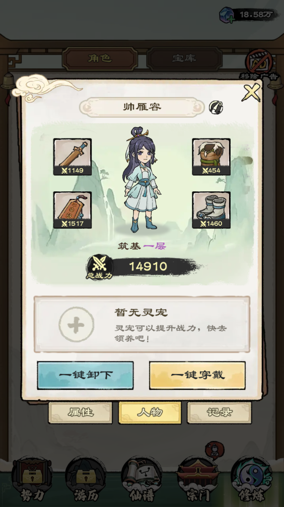 2、装备系统:通过战斗或者灵宝店可以购买装备,提升弟子的实力。