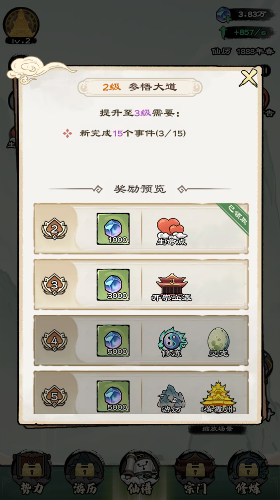 7、通过修炼我们会不断的参悟大道,提升自己的大道等级,解锁更多的功能。