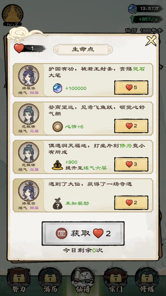 8、在修炼过程中还会获得生命点,可以用来兑换各种奖励。