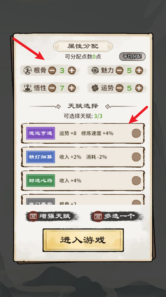 1、首先在游戏开始前,你可以对自己的各项属性进行加点,然后选择合适的天赋开始游戏。