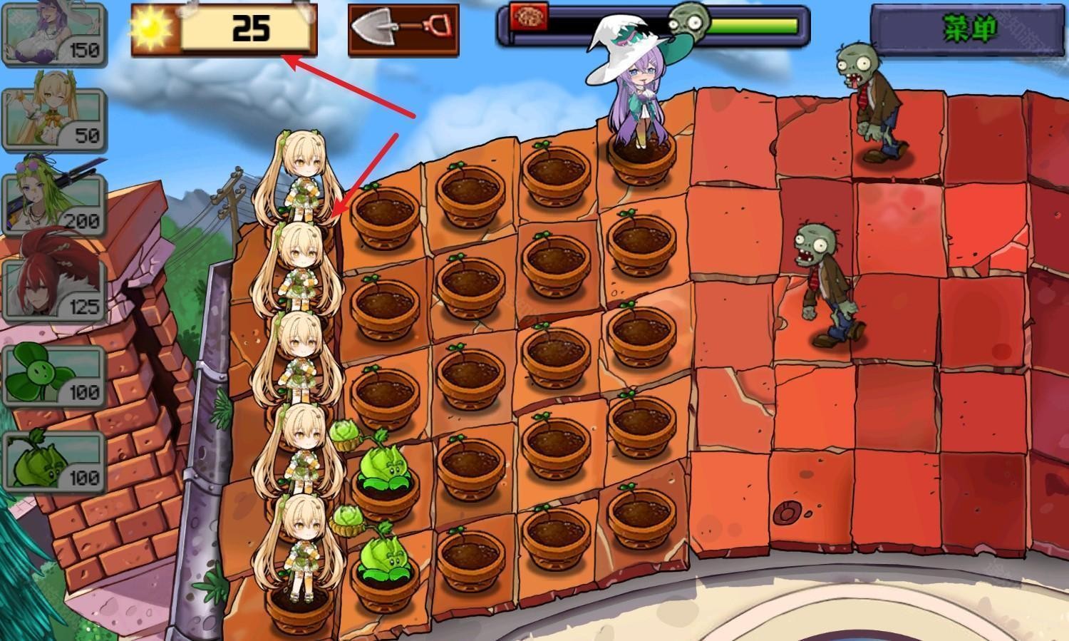2、游戏的玩法和原版一样,消耗一定阳光就能召唤植物了,部分植物萌化成了植物娘,如这里的太阳花!