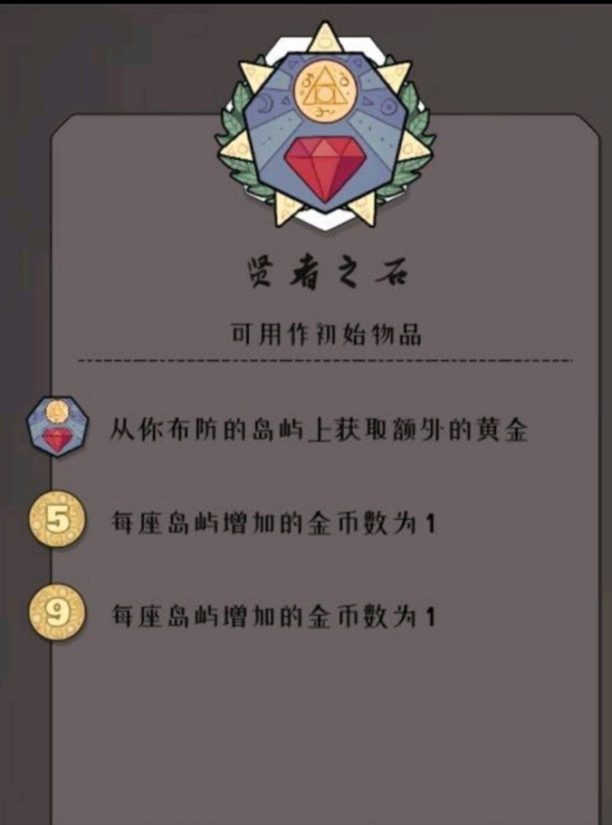 不过这里会采用四舍五入的计算方式,比如9块会变成5块,而不是4块。要是搭配贤者之石使用效果特别好,3块加上5块就能把贤者之石升满,一开始就带着这两样的话钱会非常多。这是我在极难难度下的最爱,初始选这个的话,打完第一个岛后很可能就已经有6个金币了。