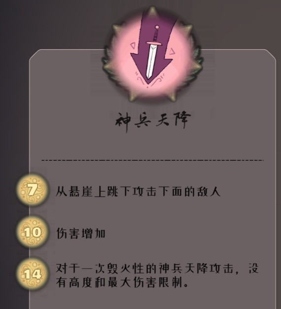 同样采用四舍五入的规则。这算是个聊胜于无的小特性:长枪2级解锁无限距离冲锋(1级时仅3格),盾兵3级可实现无限高度跳跃(本身自带2层高度基础),不过实际上这些技能有就行,没必要升到满级。弓箭的升级只单纯提升伤害数值。普通技能升级需要7、10、14的资源,而这个特性对应的升级需求是4、5、7。单看技能效果的话,弓箭手技能的覆盖范围是最大的,盾兵技能依赖地形条件,长枪技能则更偏向应急使用。