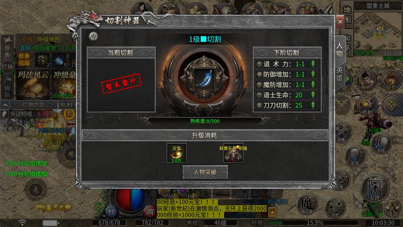 1、切割神器:消耗元宝和妖兽头颅进行晋升,能够提高职业专属属性和切割伤害。