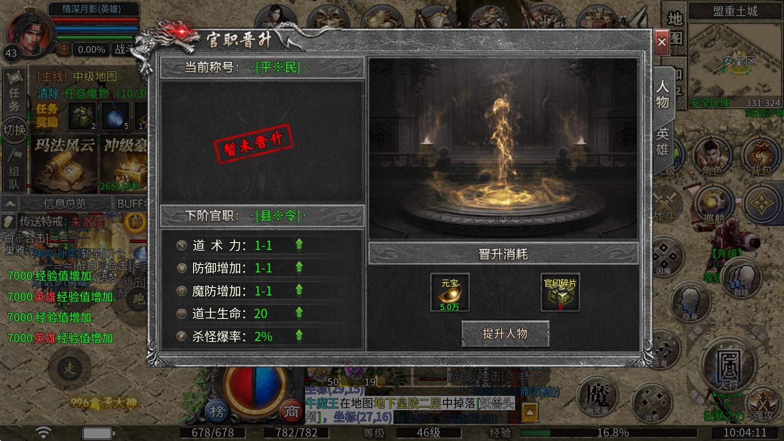 2、官职晋升:消耗元宝和官印碎片即可提升,可以提高杀怪的爆率。