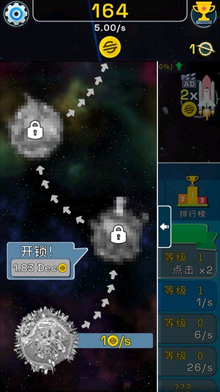 2、第一栏为升级栏,在此玩家可以使用金币进化星球,每次升级都可以让你的星球成长,其中每种进化需要花费的金币都不一样,进化的等级越高则耗费的金币则越多。