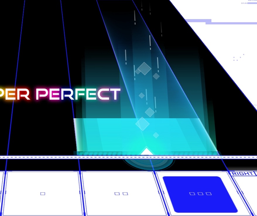 不同的歌曲与难度中,可能会出现流淌的白色音符、位于中央的音轨。以及流淌的黄色音符、位于两侧的音轨。