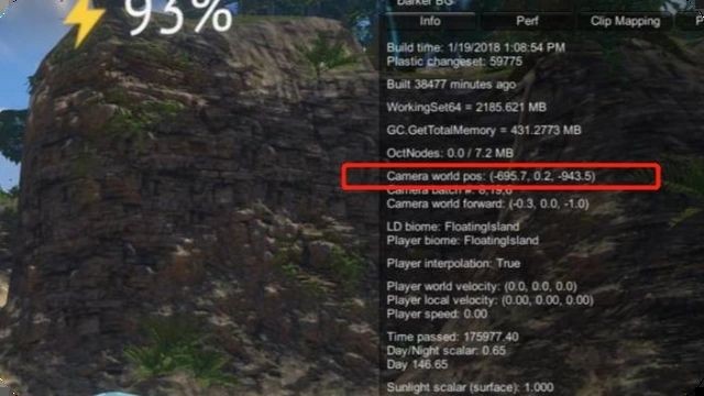 4、这时可以查看当前所在的坐标,朝着大概(-695.7,0.2,-943.5)这个坐标的方向调整行进路线,就能到达绿岛的登陆入口了。