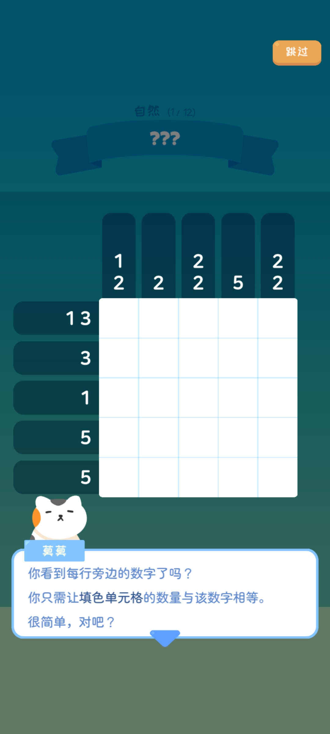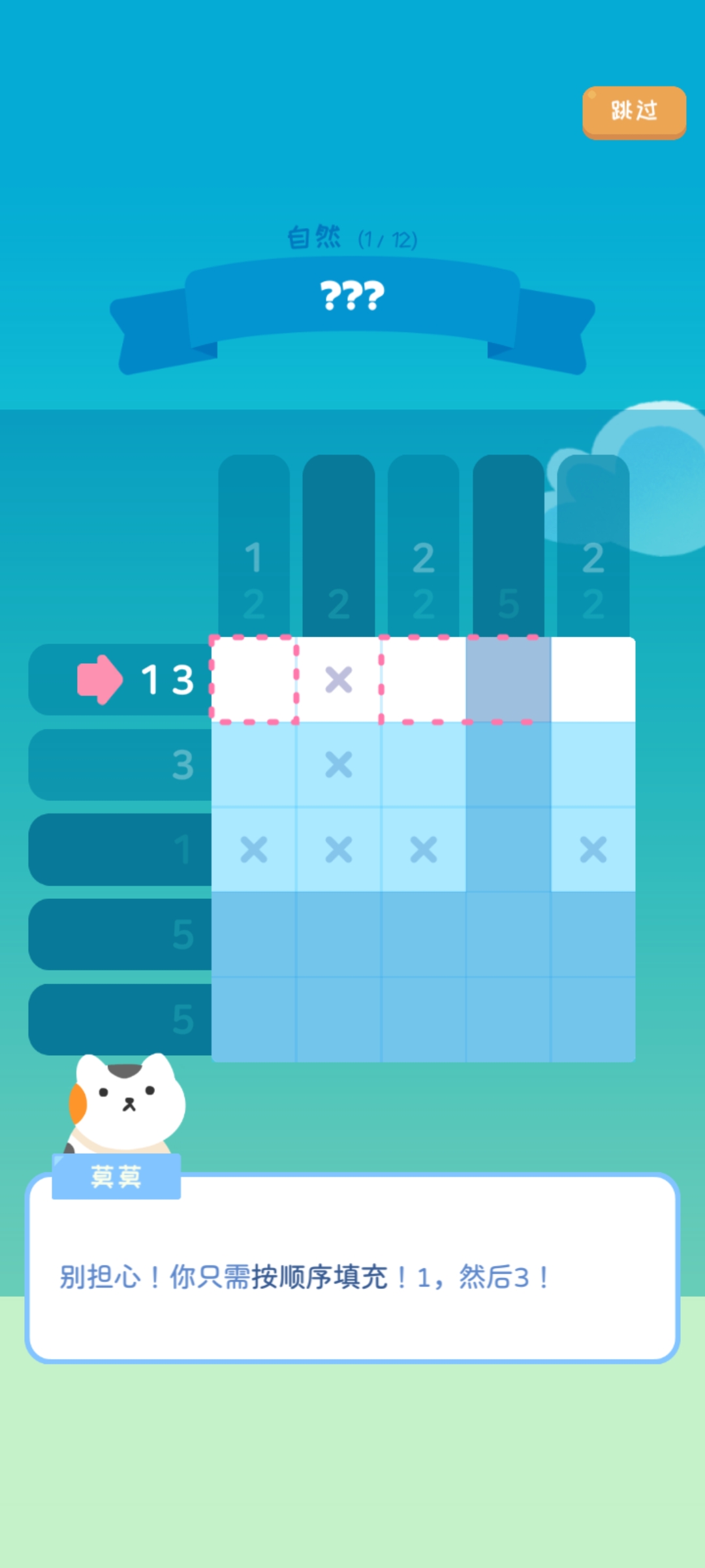1、按照行列给出的数字提示,把对应的格子填充正确,就能完成图案啦。