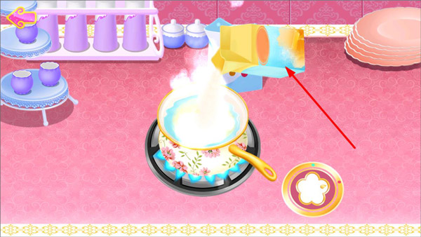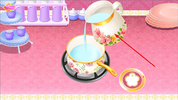 2、进入“厨房”场景,点击水壶把水倒进锅里,接着启动加热程序。