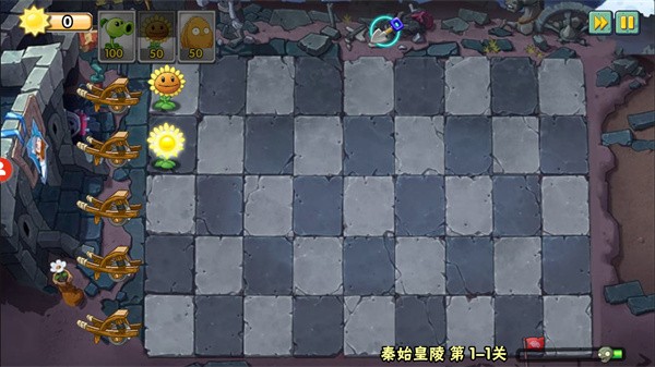 2、建议在最末排布置多株向日葵,稳定提供阳光资源,是建立防御体系的前提。