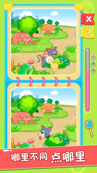 宝宝玩找茬是一款专门为低龄儿童打造的找不同益智游戏。它采用Q版动画风格与卡通化的图片,能有效吸引宝宝的注意力,同时在寻找图片差异的过程中,帮助宝宝锻炼观察力和逻辑思维能力。游戏设置了“儿童宝宝类”和“休闲益智类”两种模式,分别满足不同年龄段宝宝的需求。简单易上手的操作,搭配温馨可爱的配音以及奖励机制,让孩子在轻松愉快的氛围中感受成长的乐趣。
