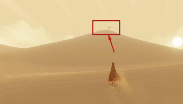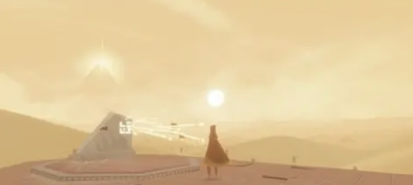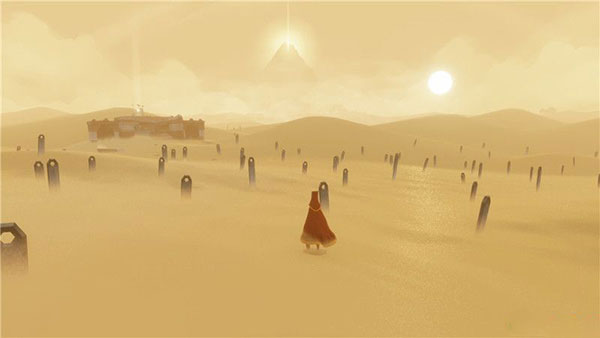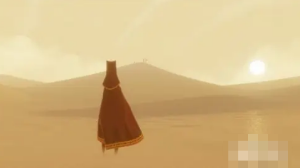 在《风之旅人》游戏刚开始时,你只需要始终朝着远方那座高山的方向行进就可以了。