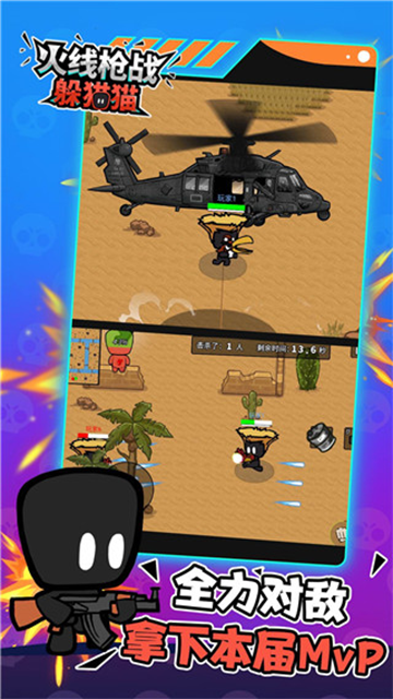 火线枪战躲猫猫是一款将“躲猫猫”玩法与FPS射击相结合的创意对抗。玩家在每局游戏中会被分配到“猫猫”或“佣兵”两个阵营,猫猫可以变身成场景内的各种道具进行伪装隐藏,而佣兵则需要在限定时间内识破伪装、全歼敌方。游戏采用第一人称视角,射击体验更加真实紧张,搭配丰富的地图与枪械系统,打造轻松却又不失竞技感的趣味战斗场面。