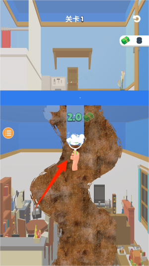 2用清洁类工具对准脏的地方拖过去擦干净,每清理好一块地板,就会有能捡的金币掉下来。