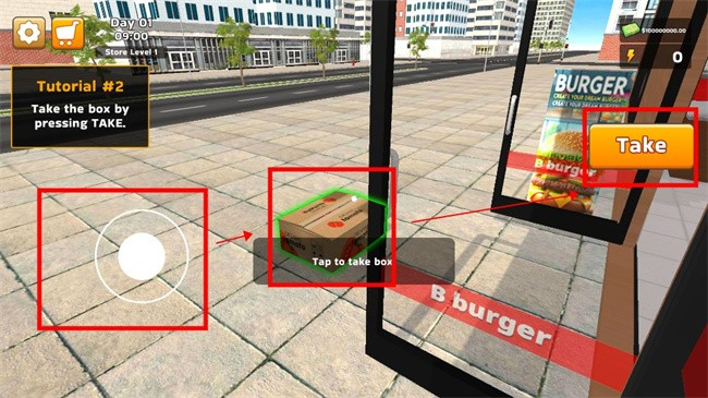 进入游戏后,先走到门口的快递箱处,点击“Take”按钮来领取物资。