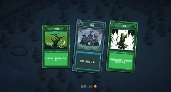2、游戏界面底部陈列着各式各样的卡牌,每张卡牌都具备独特的功能。玩家能够借助卡牌建造铁匠铺以升级武器,也可以建造侦查塔来提前侦察敌人的动向。