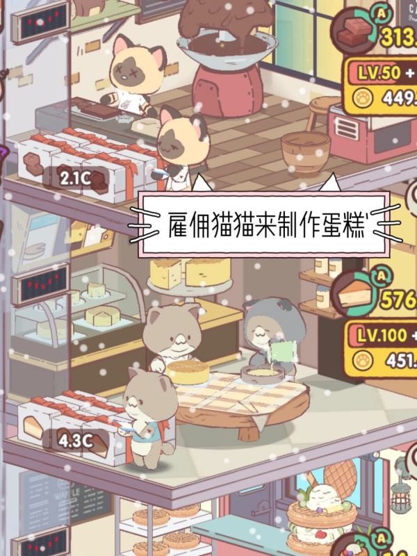 1、玩家需安排猫咪员工负责不同的制作岗位,制作更多种类的甜点。