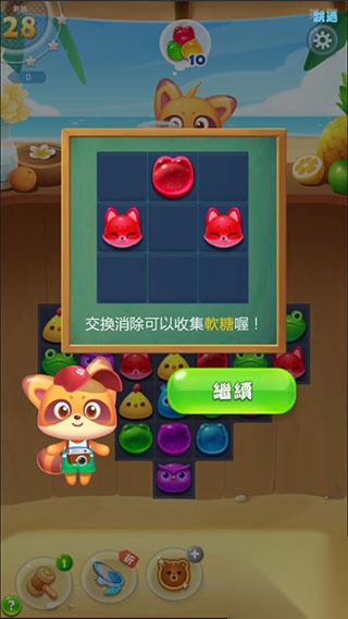 1正式进入关卡的时候,游戏会给我们一些小提示,通过交换消除可以收集软糖,这些软糖就是我们本关需要收集的目标。