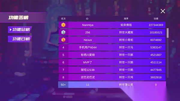 3、每一轮挑战所获得的得分,都会以“功德”的形式进行累加,大家能够在页面右上角查看排行榜,和其他玩家比拼一下实力。