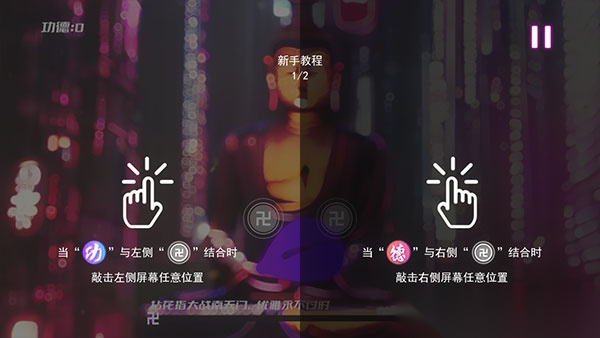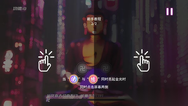 6、要是遇到“功”和“德”一同闪烁金光的情形,得同时点击屏幕两边完成双击动作;游戏过程里能随时借助右上方的按钮暂停。