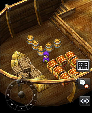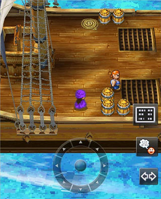 离开房间后才意识到身处一艘船上,得换个角度才能瞧见船帆后方的木桶。常玩RPG的玩家大概都和我有个共同点——每到新场景总忍不住把各个角落都翻找一遍,玩《勇者斗恶龙5》自然也不例外。不妨先把初始房间和甲板上的柜子、书架还有那些木桶都检查一遍,说不定能找到些有用的道具和物品。