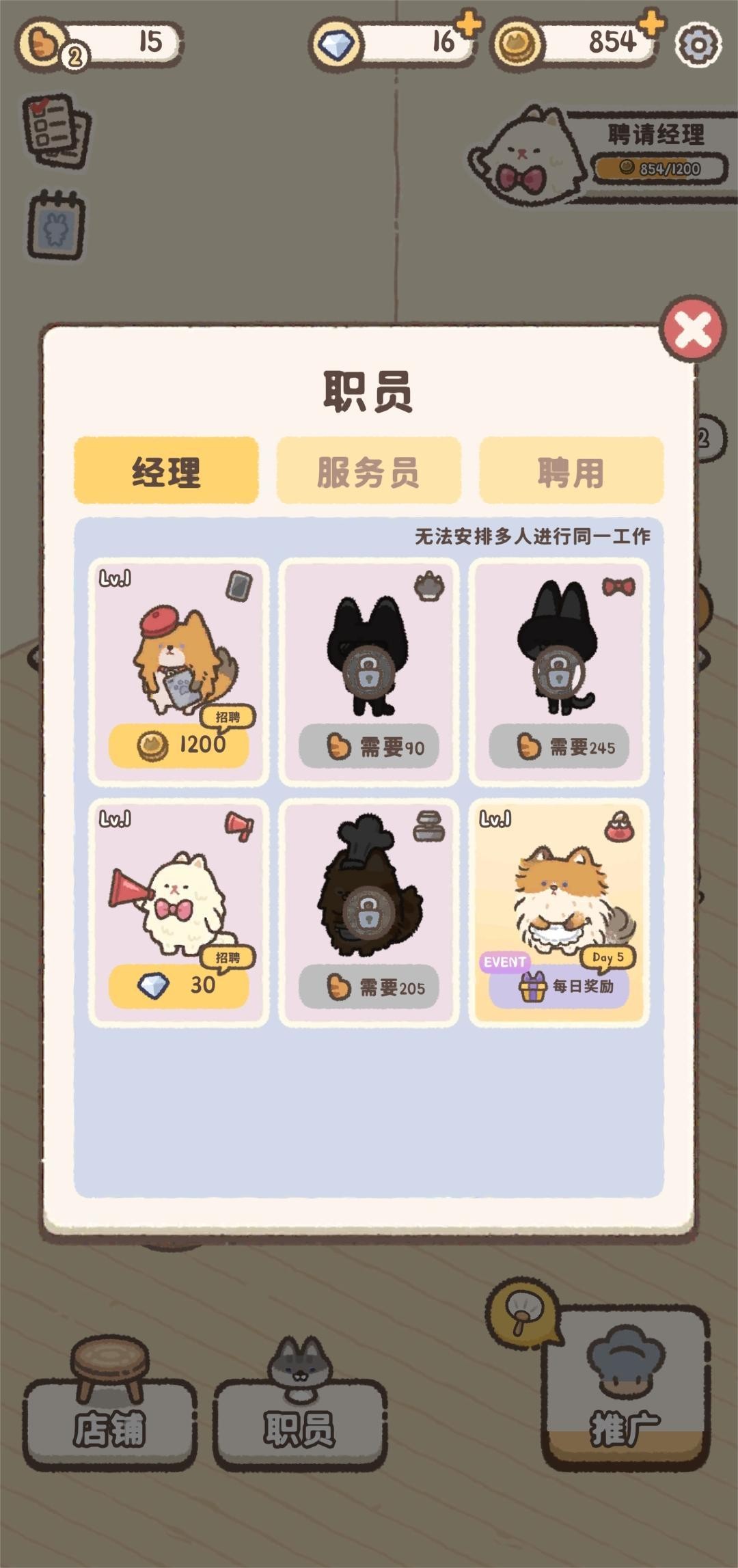 3、招募可爱的动物服务员们,打造超萌的招待团队。