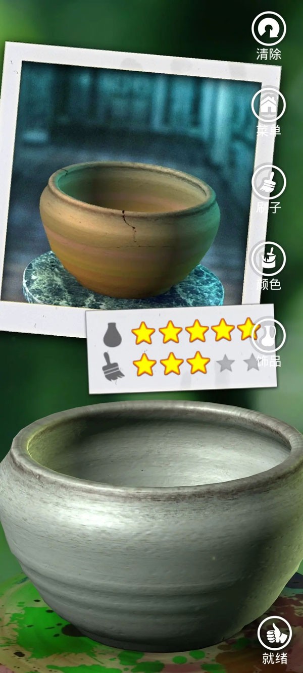 1、操作方式轻松简单,依靠触控和重力感应就能完成全部陶艺流程。